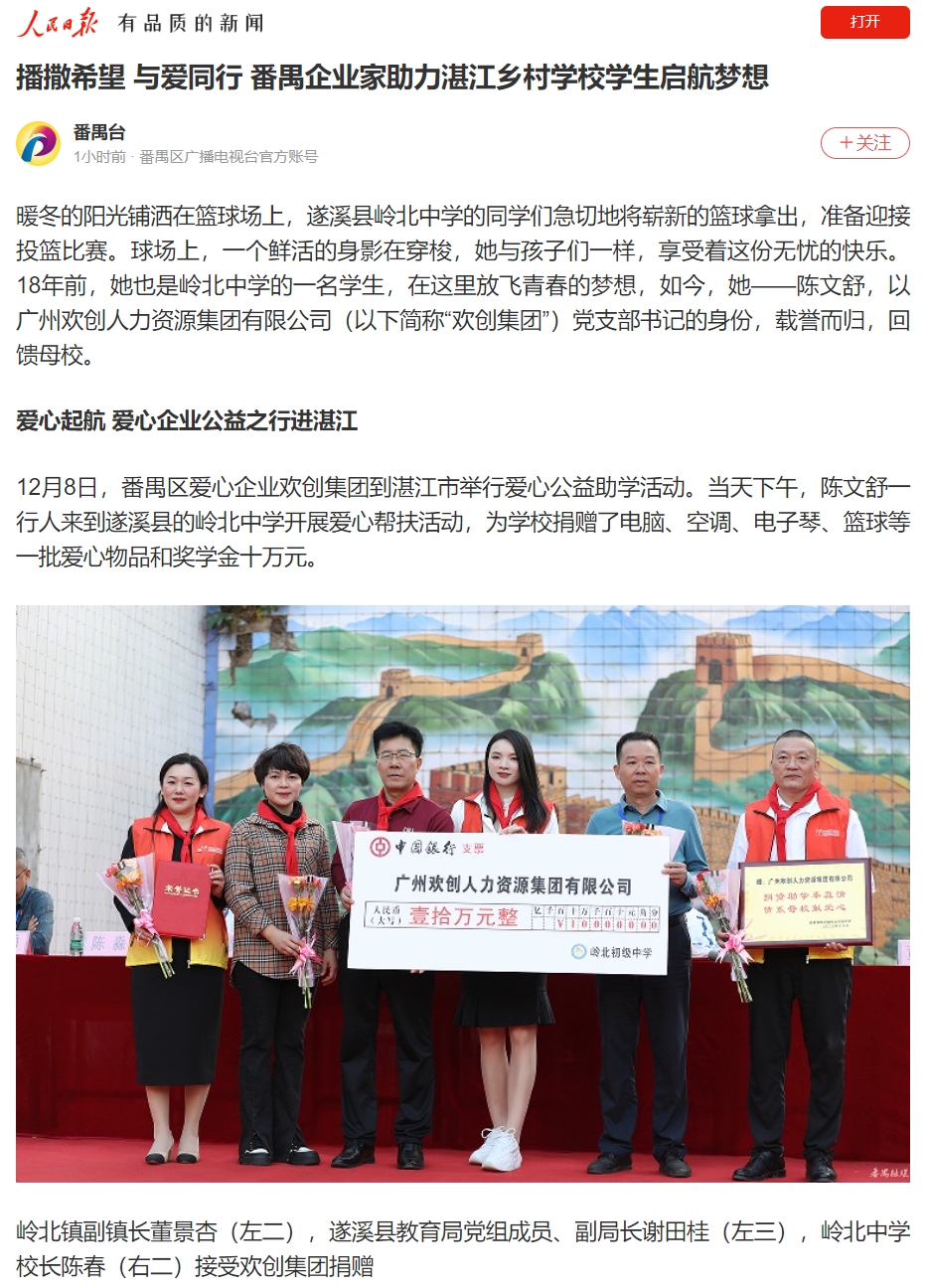 番禺融媒:播撒希望 与爱同行 番禺企业家助力湛江乡村学校学生启航梦想